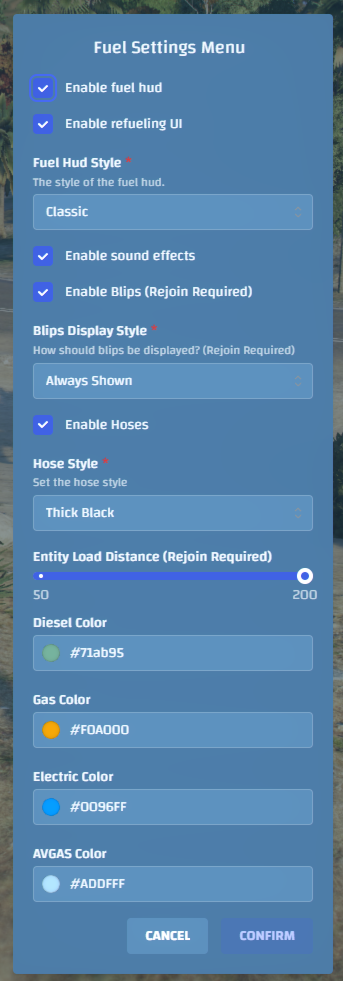 Players can open a client-sided configuration menu via the command /fuelsettings. This will show a menu in-game with various config options, this allows your players to customize their experience.